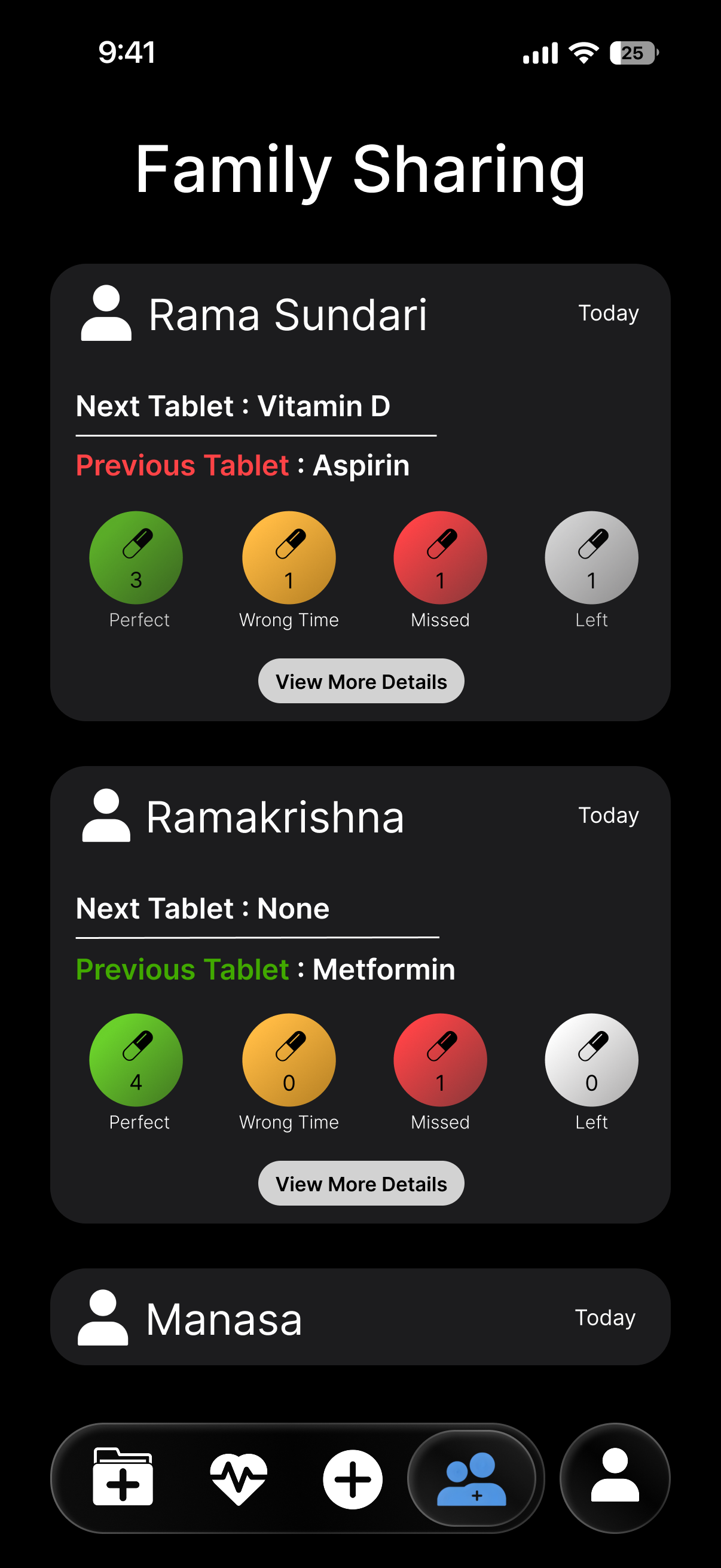 See if your parents took their meds in real time. Simple status signals (Green for Taken, Red for Missed) keep you informed without being intrusive.